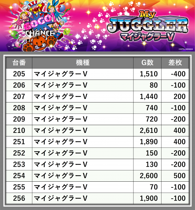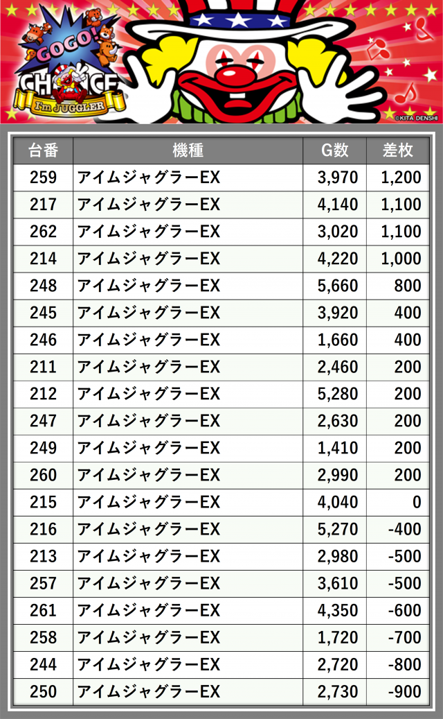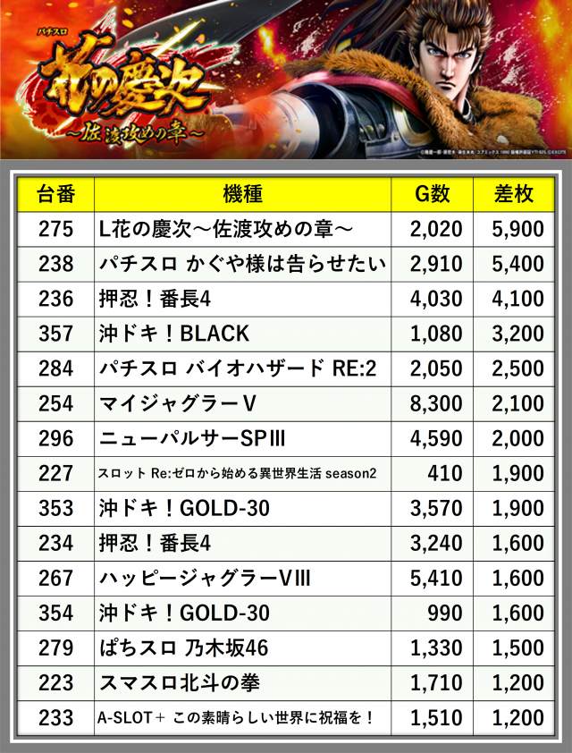 厳選された取材対象機種をはじめ、その他スロット全体から好記録が飛び出した!プレイヤーが楽しんだ1日を下記データにて振り返ってみて欲しい。