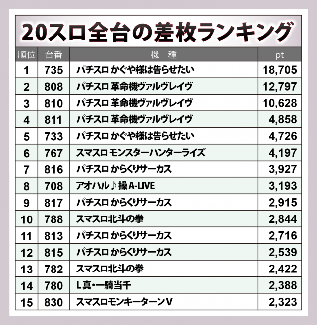 後述する注目機種以外を成績順に記していくと、+18,700枚超と恐らくコンプリート機能が発動した『パチスロ かぐや様は告らせたい』735番台が全126台の頂点に輝き、他にも+4,700枚超の台を輩出した。