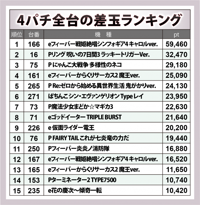 この日の首位に君臨したのが導入間もない『eフィーバー戦姫絶唱シンフォギア4 キャロルver.』166番台で、+59,500個弱のビッグヒットを計上。また+18,500個超の台が追随した。