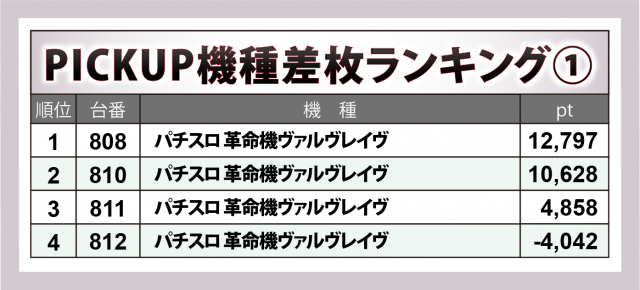 特に光を当てたいのが『パチスロ 革命機ヴァルヴレイヴ』4台。表で挙げた3台が勝利に成功し、5桁プラスが2台・+4千9百弱と、店内随一の盛り上がりに達していた。