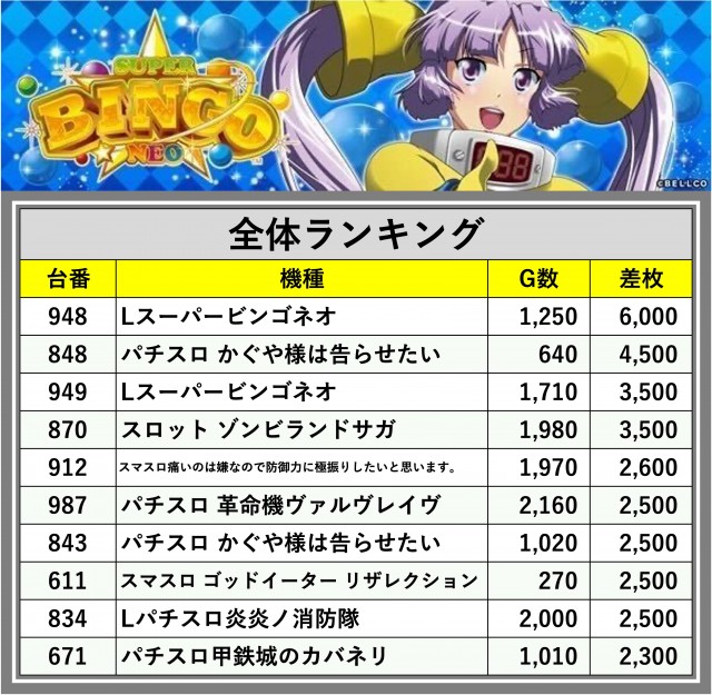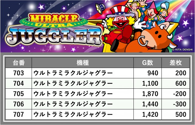 厳選された取材対象機種をはじめ、その他スロット全体から好記録が飛び出した!プレイヤーが楽しんだ1日を下記データにて振り返ってみて欲しい。