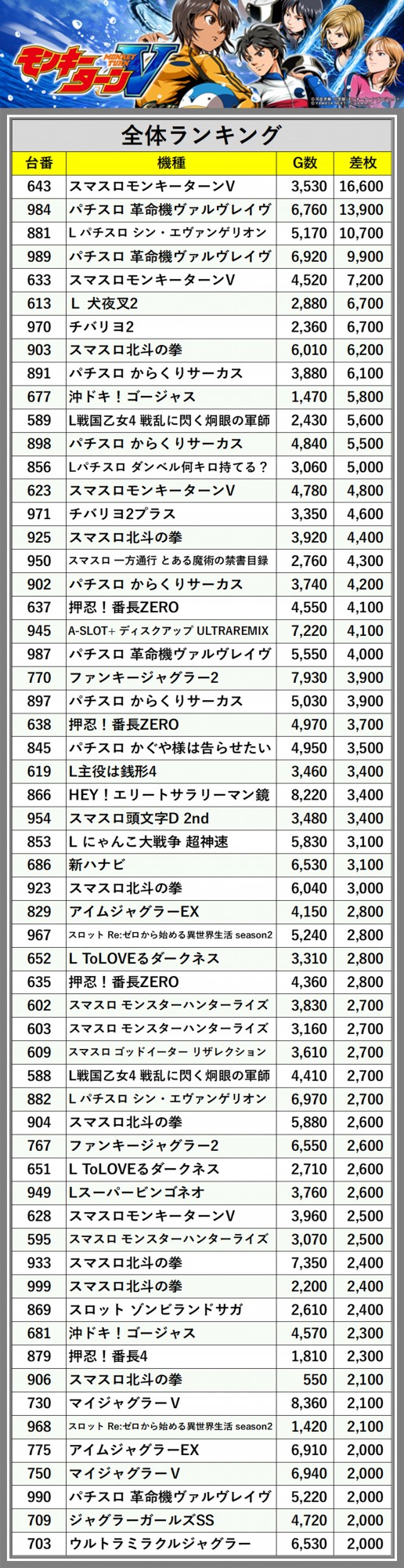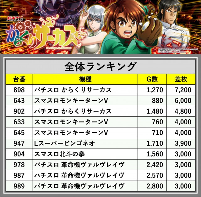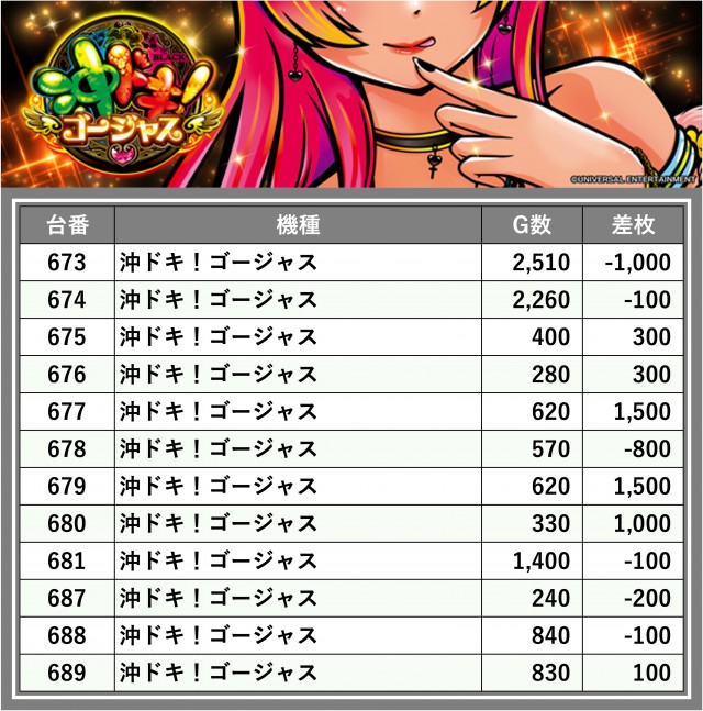 厳選された取材対象機種をはじめ、その他スロット全体から好記録が飛び出した!プレイヤーが楽しんだ1日を下記データにて振り返ってみて欲しい。