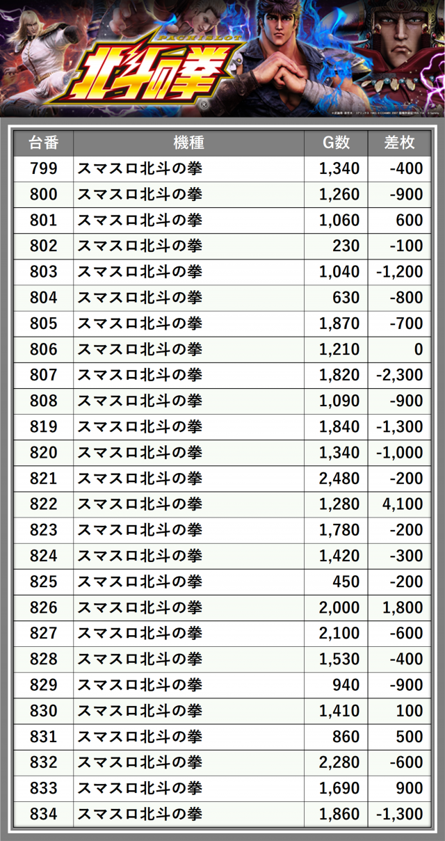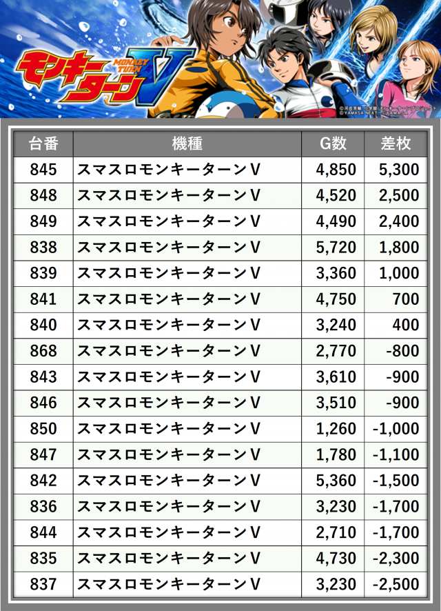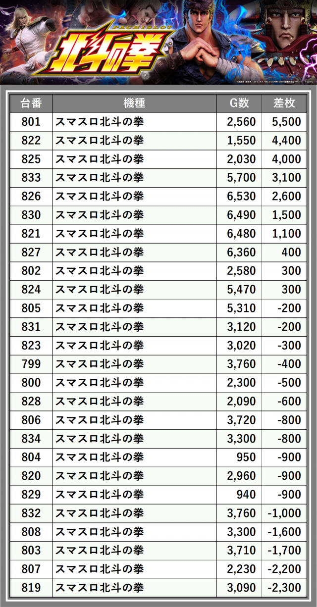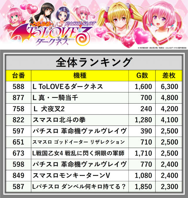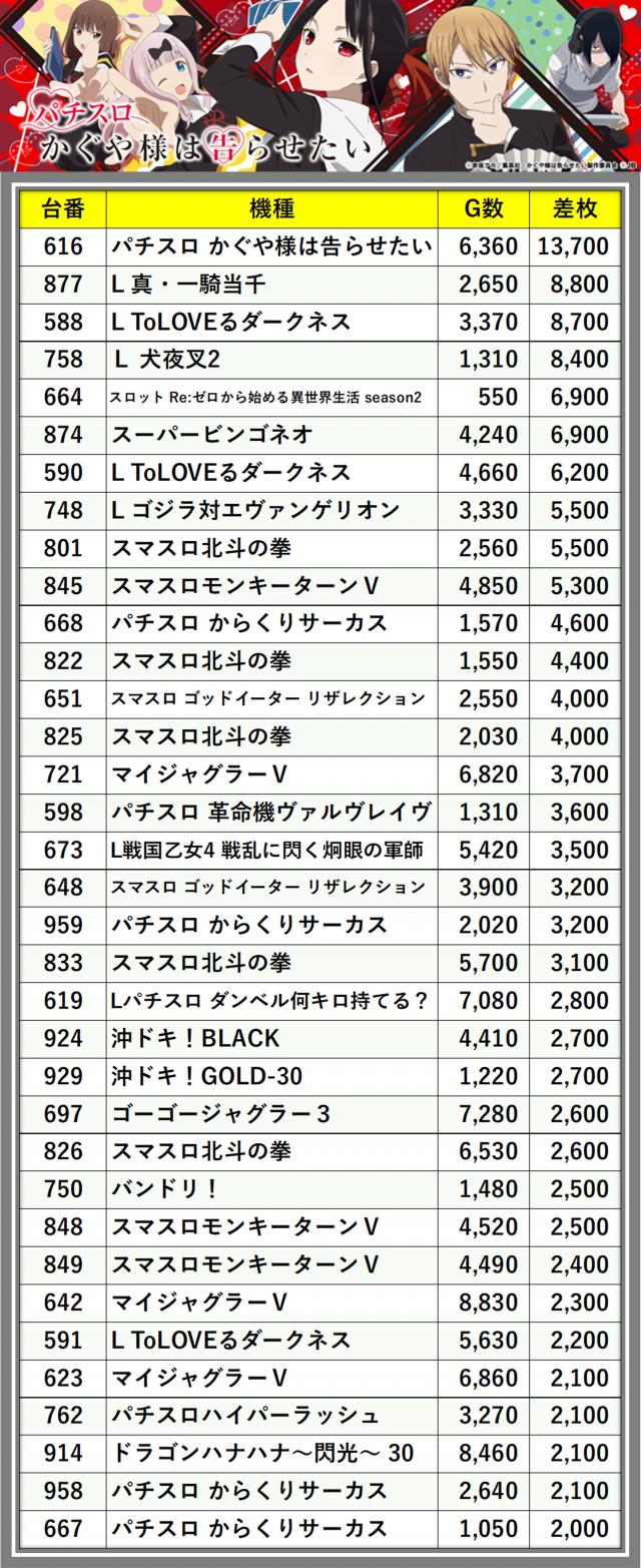 ※差枚数順に掲載しています