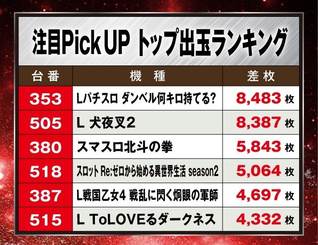 この日は人気のスマスロが中心となって店内を盛り上げていた。なかでも『Lパチスロ ダンベル何キロ持てる?』と『L 犬夜叉2』が+8,000枚超、『スマスロ北斗の拳』が+5,000枚超を叩き出す見事な結果を残している。