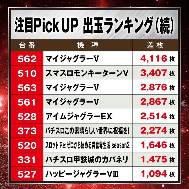 また、その他の機種ではジャグラーシリーズが大奮闘しており、+4,116枚を記録した『マイジャグラーⅤ』をはじめ『アイムジャグラーEX』や『ハッピージャグラーVⅢ』が好成績を残しているだけにファンも大満足だったに違いないだろう。