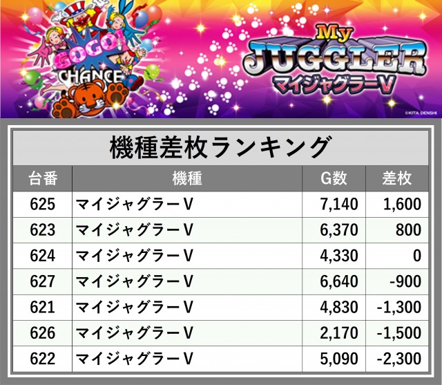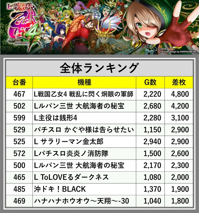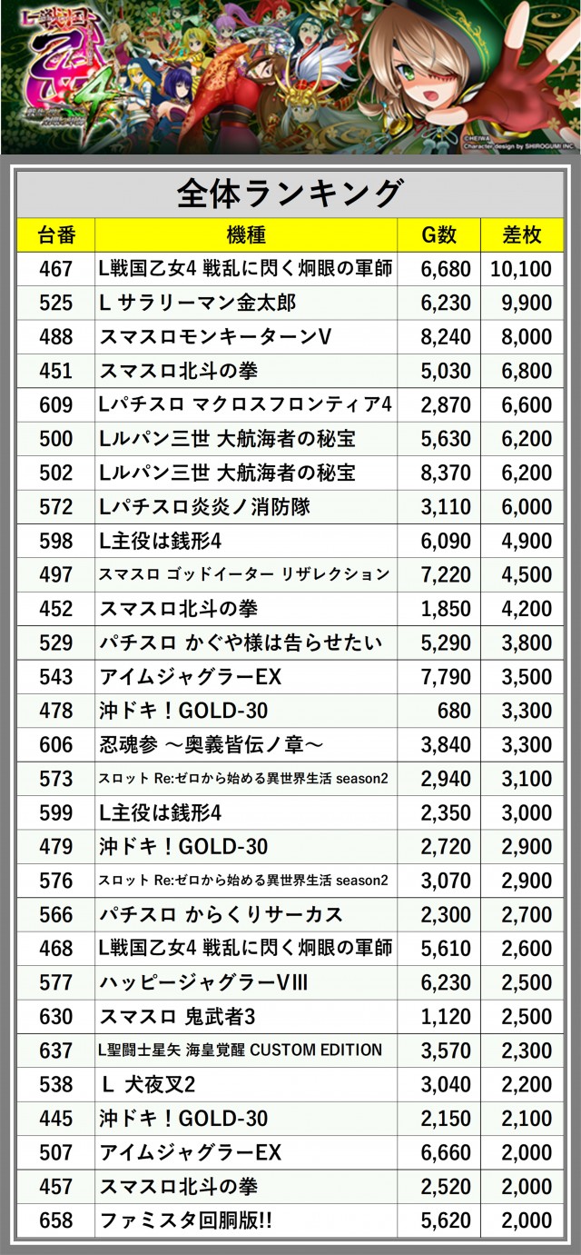 厳選された取材対象機種をはじめ、その他スロット全体から好記録が飛び出した!プレイヤーが楽しんだ1日を下記データにて振り返ってみて欲しい。