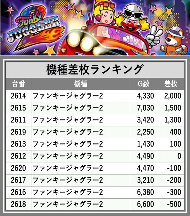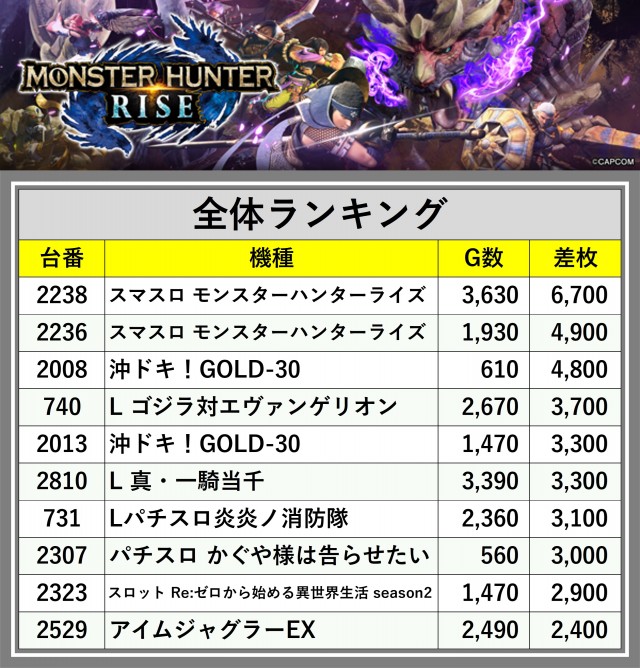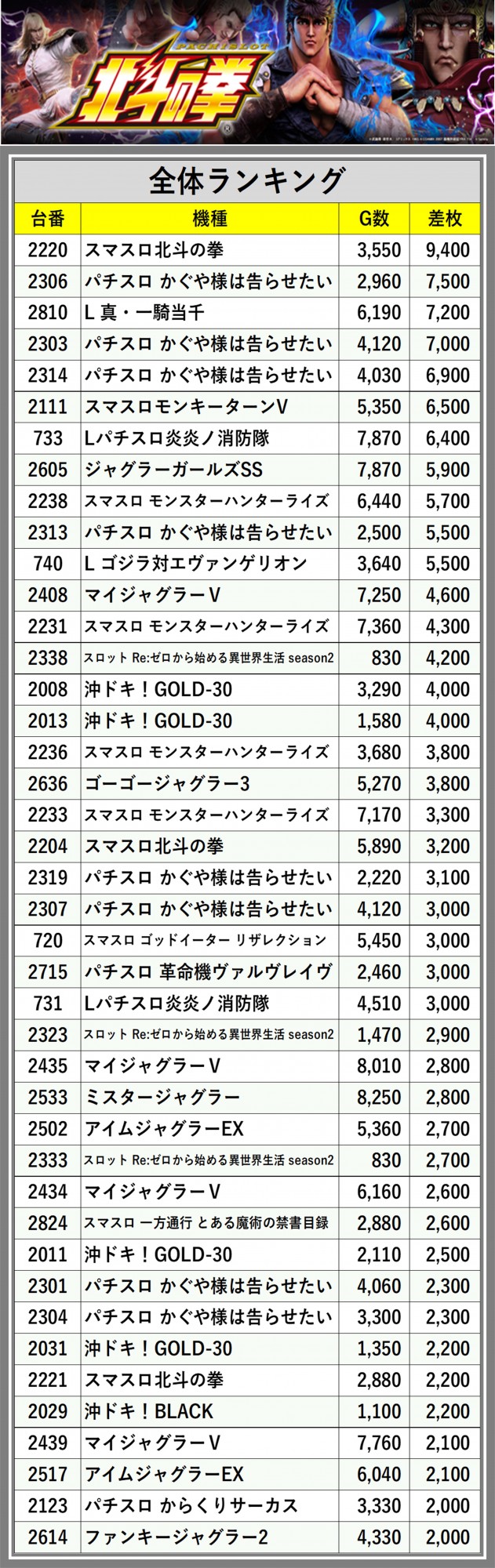※差枚数順に掲載しています