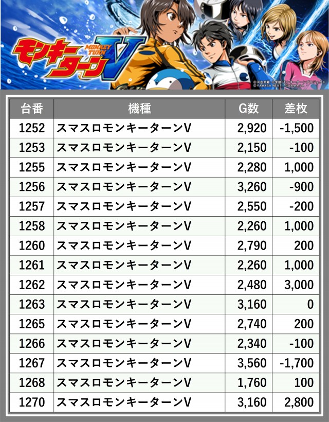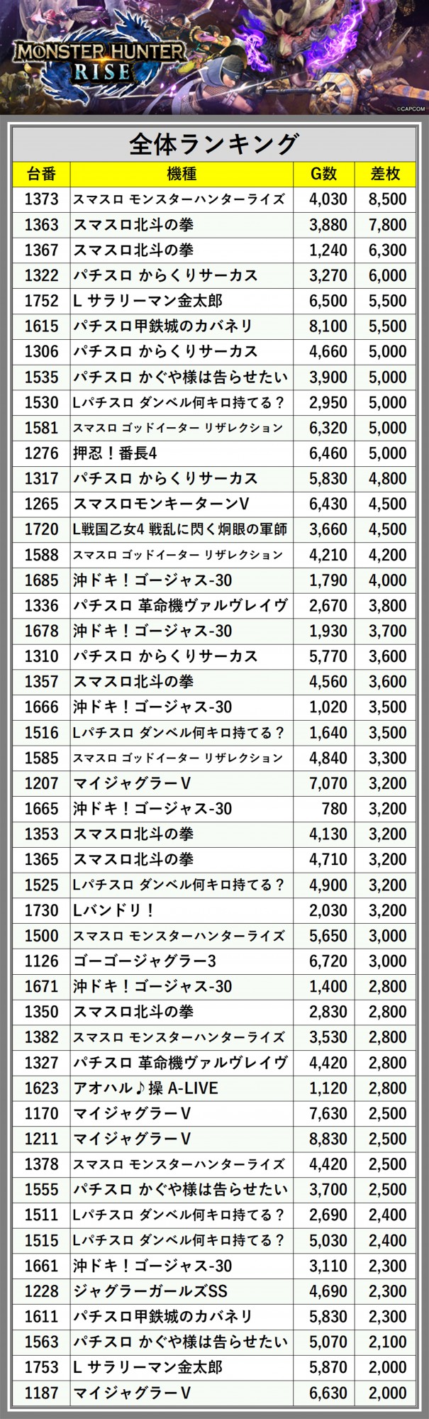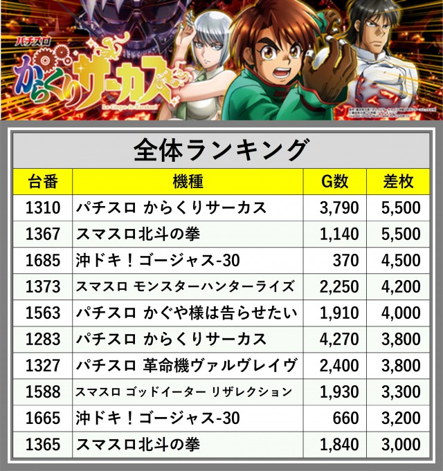 厳選された取材対象機種をはじめ、その他スロット全体から好記録が飛び出した!プレイヤーが楽しんだ1日を下記データにて振り返ってみて欲しい。
