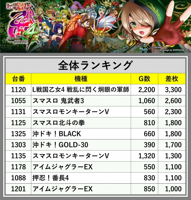 ※差枚数順に掲載しています