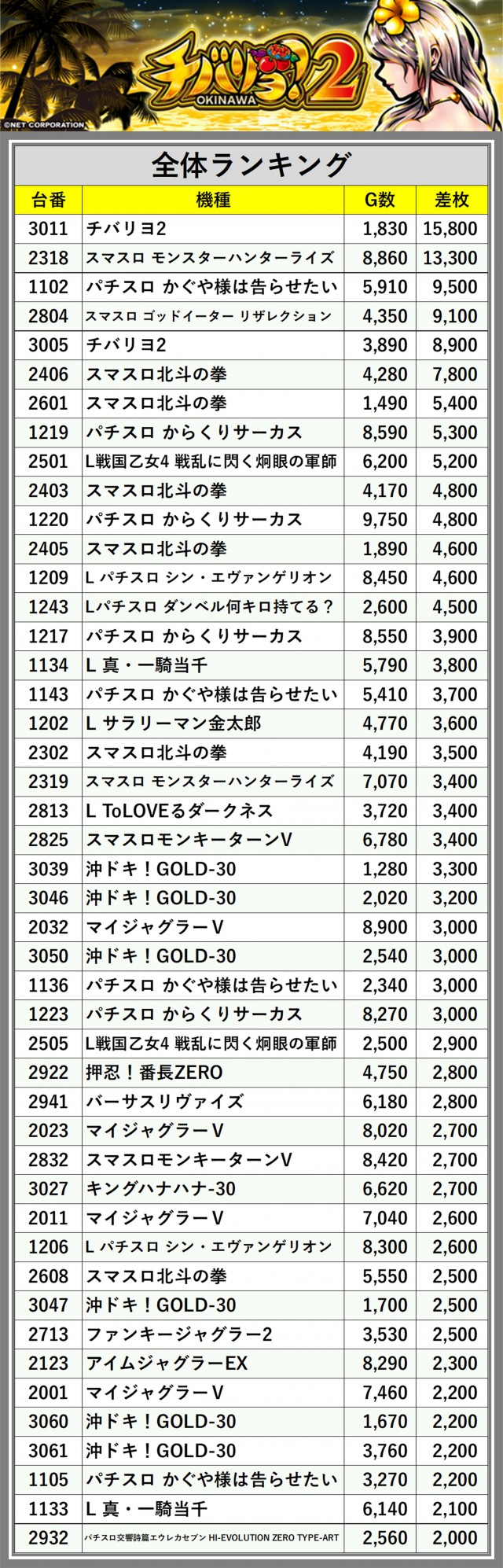 厳選された取材対象機種をはじめ、その他スロット全体から好記録が飛び出した!プレイヤーが楽しんだ1日を下記データにて振り返ってみて欲しい。