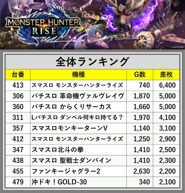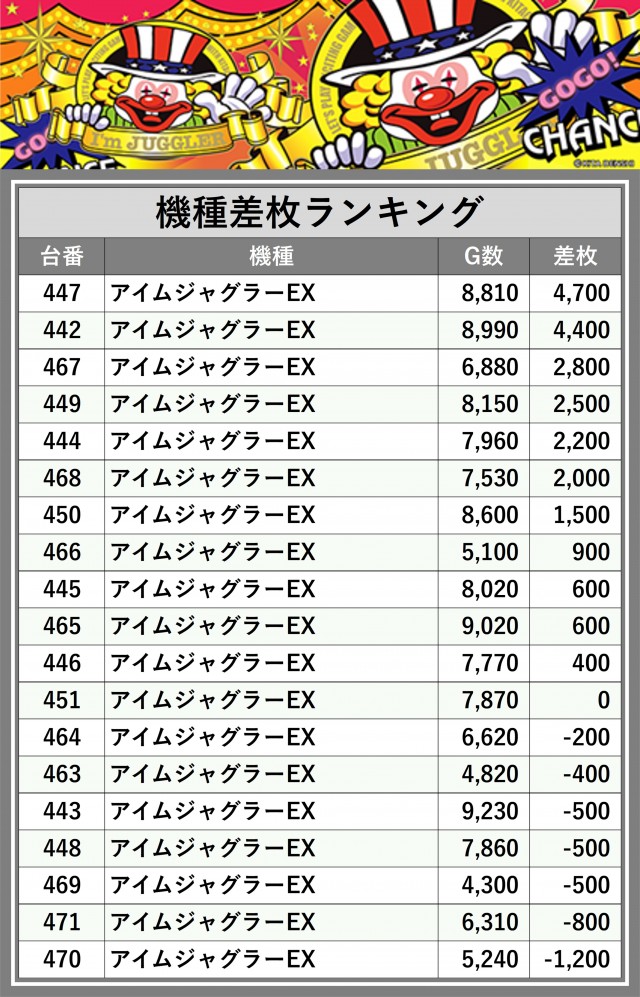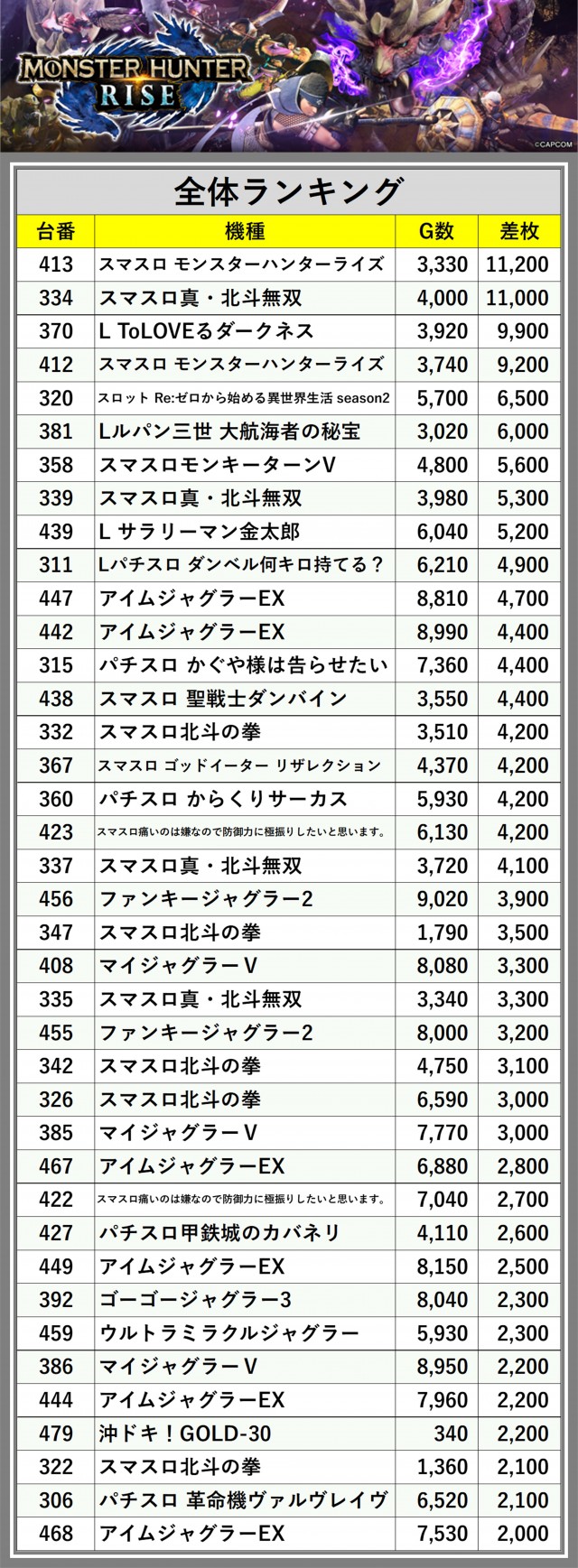 厳選された取材対象機種をはじめ、その他スロット全体から好記録が飛び出した!プレイヤーが楽しんだ1日を下記データにて振り返ってみて欲しい。