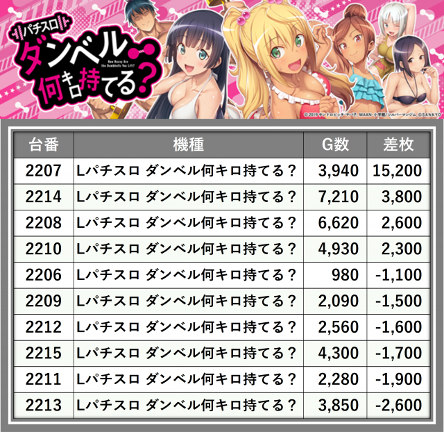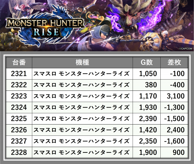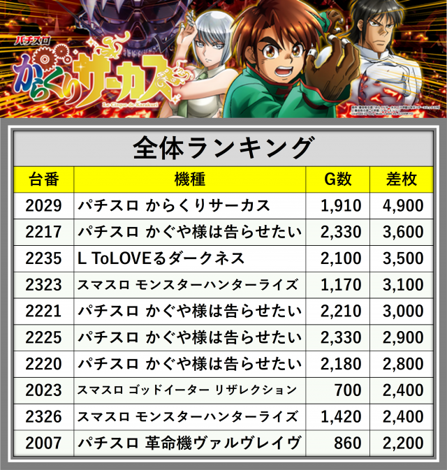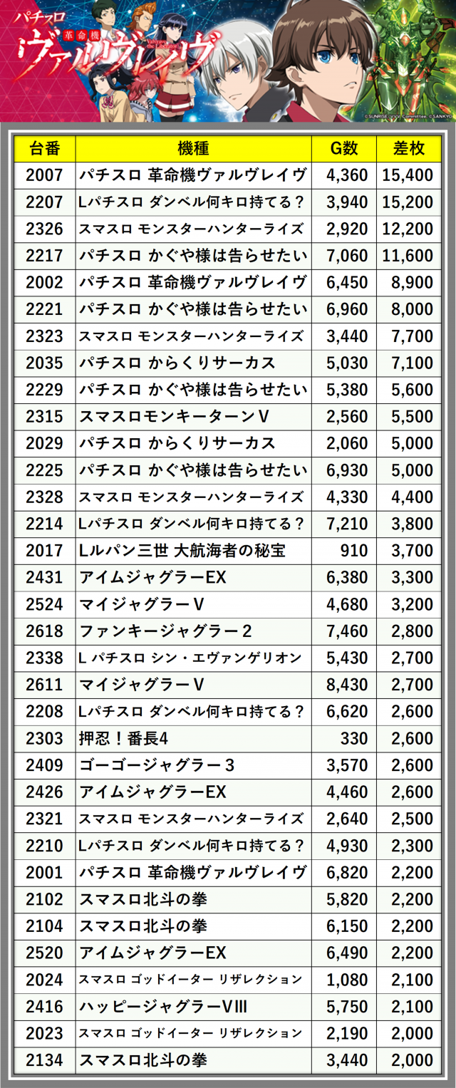 厳選された取材対象機種をはじめ、その他スロット全体から好記録が飛び出した!プレイヤーが楽しんだ1日を下記データにて振り返ってみて欲しい。