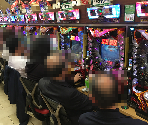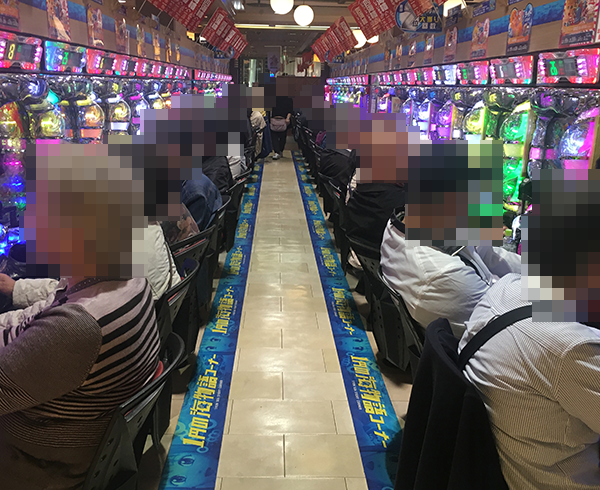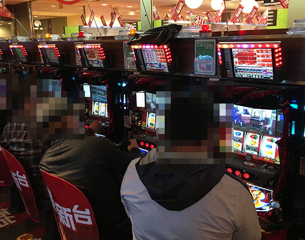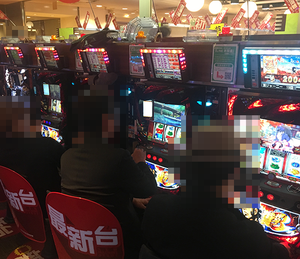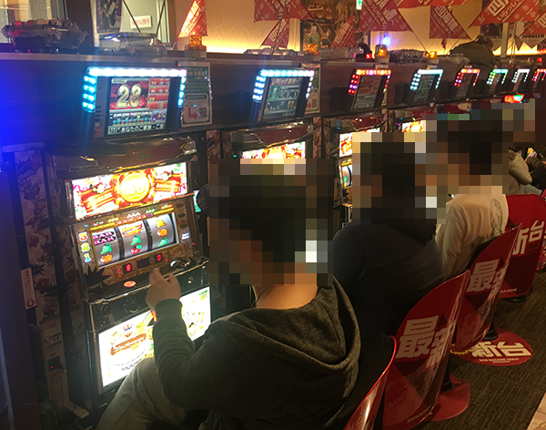 午後になっても、20円パチスロの「バジリスク~甲賀忍法帖~絆」と「押忍!番長3」が人気。笑顔で遊技を楽しんでいるプレイヤーが多く、活気も感じられた。