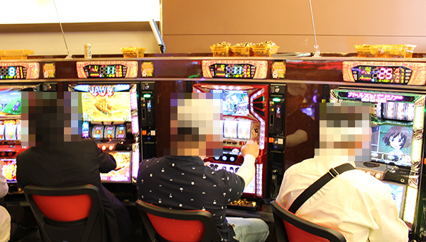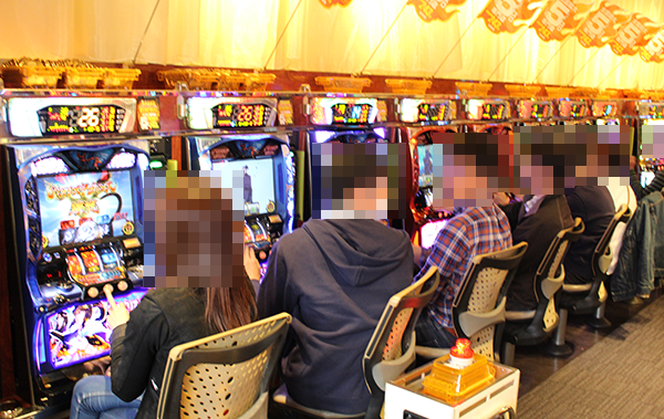 14時をまわった頃のホール内では、「沖ドキ!」と「バジリスク~甲賀忍法帖~絆」が盛況。朝イチから同じ台を打っているプレイヤーもみられ、満足感を得られていることが伝わってきた。