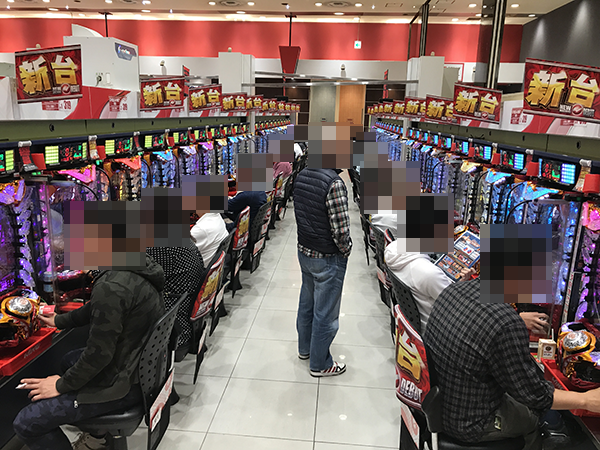 開店してすぐのパチンココーナーでは、4円パチンコの最新機種である「ぱちんこCR北斗の拳7 転生」がほぼ満席といった状況。