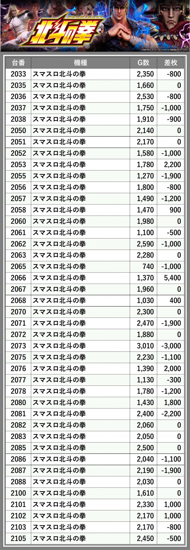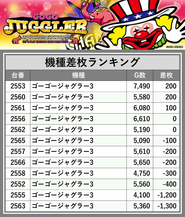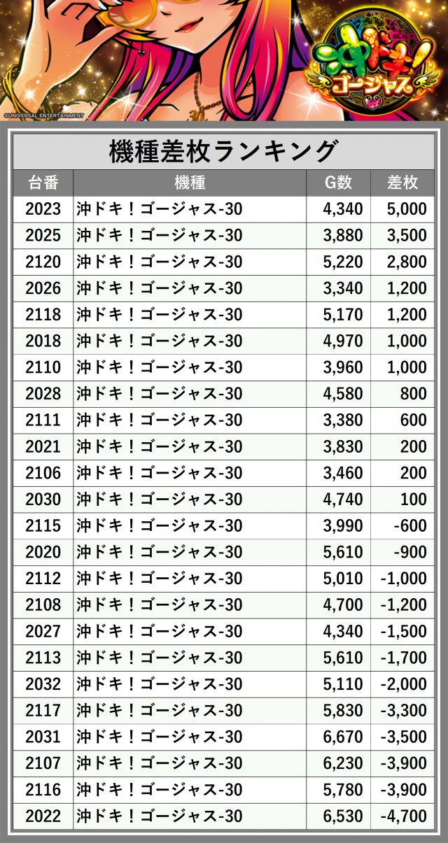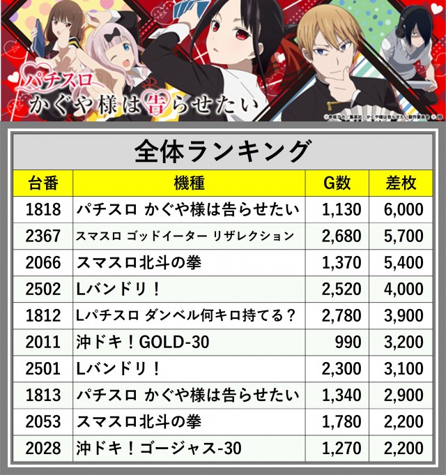 ※差枚数順に掲載しています