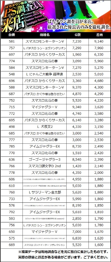 581『スマスロモンキーターンV』:9140枚757『L パチスロ シン・エヴァンゲリオン』:7960枚697『パチスロからくりサーカス』:6330枚