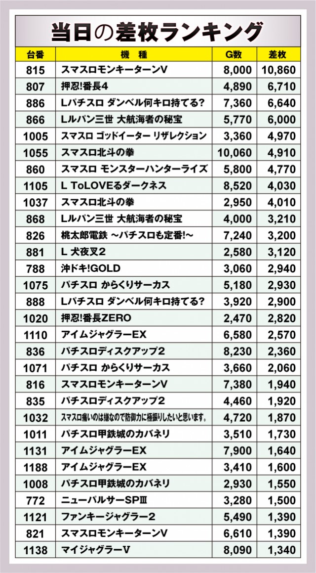 以下も人気AT機が並んでいくのだが、なかにはジャグラーシリーズもランクインしており、機種の偏りが見られない今回の取材内容となった。