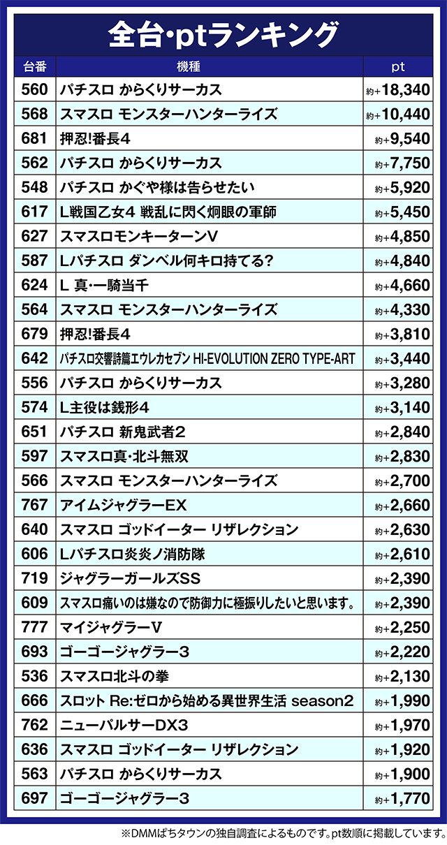 「パチスロ かぐや様は告らせたい」の548番台や「L戦国乙女4 戦乱に閃く炯眼の軍師」の617番台も約+5,400pt以上と、多くの台が結果を残した。
