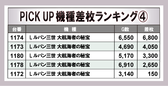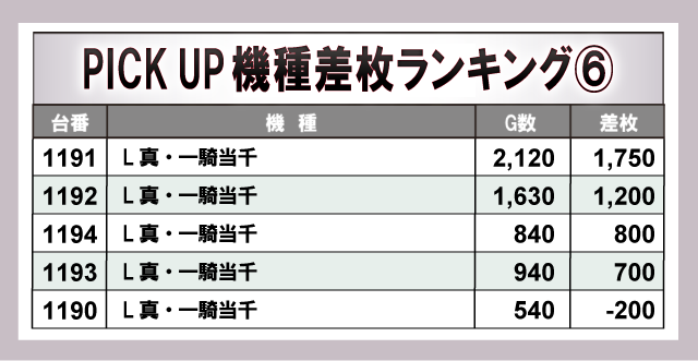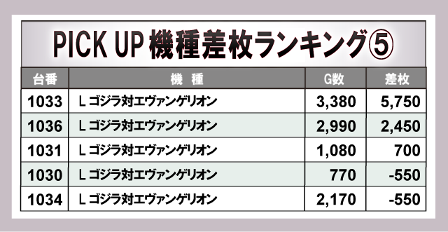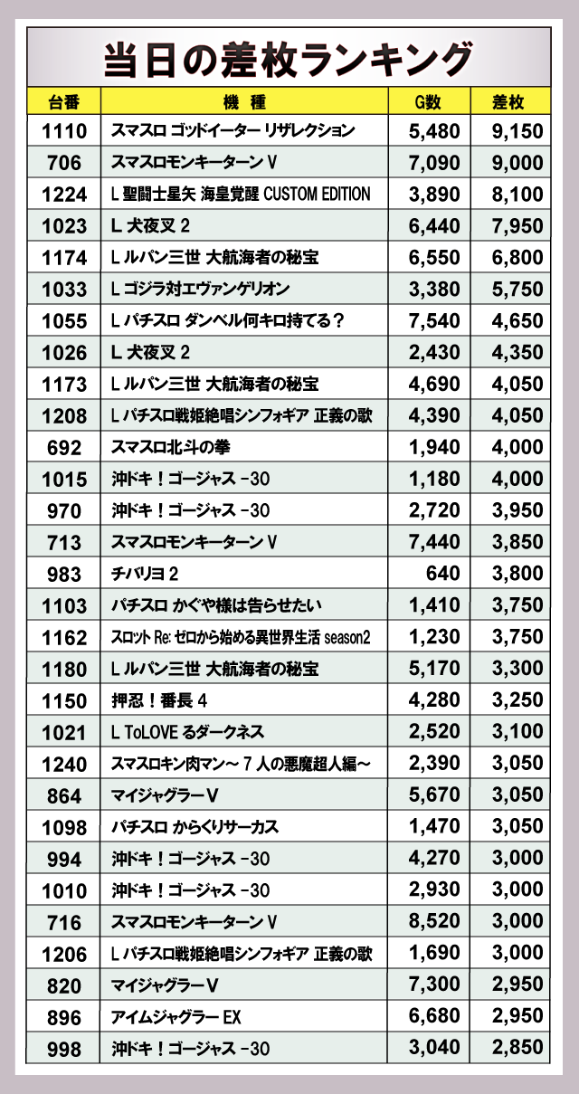 上表の機種は4桁プラス台が多数発生し、しっかりとポテンシャルを解放していた様子が窺える。いずれの台もコンスタントに大当りを積み重ね、右肩上がりのグラフを描いていたのは何よりも好感を覚えるポイントだ。その中でも『マイジャグラーⅤ』『アイムジャグラーEX』は特に優秀台が多く存在し、大いに盛り上がりを見せていた!