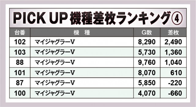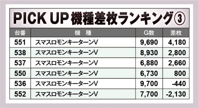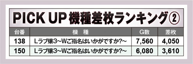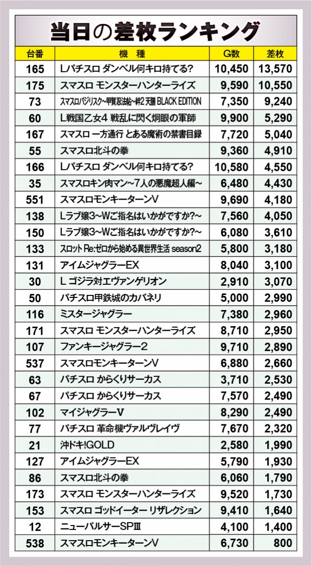 万枚OVERを達成した『Lパチスロ ダンベル何キロ持てる?』は全台プラス差枚数を達成するだけでなく、万回転OVERのダブルを打ち立てている。『Lラブ嬢3〜Wご指名はいかがですか?〜』も同様に盛り上がっており、遊技していたファンは口角を緩めていたことだろう。また『スマスロモンキーターンV』『マイジャグラーⅤ』も高いパフォーマンスを披露しており、ファンに笑顔を届けていた。