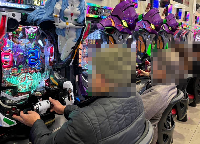 「ぱちんこ シン・エヴァンゲリオン Type レイ」と「新世紀エヴァンゲリオン~未来への咆哮~」にも、うれしそうに遊技をおこなっている姿が並んでいた。