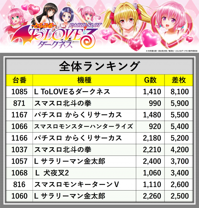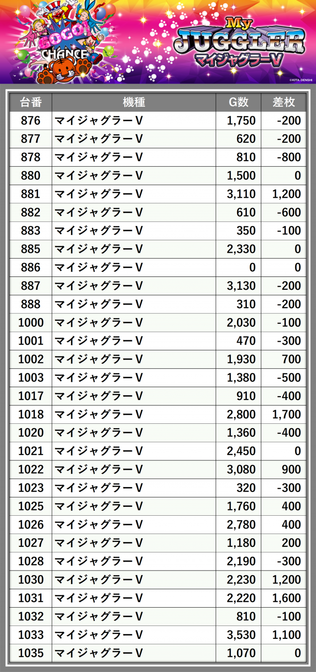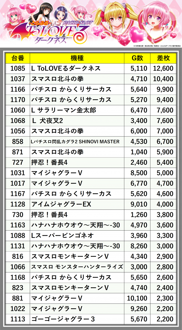 厳選された取材対象機種をはじめ、その他スロット全体から好記録が飛び出した!プレイヤーが楽しんだ1日を下記データにて振り返ってみて欲しい。