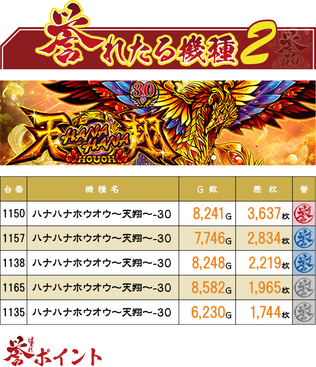 5台の誉レコード(=1,000枚以上)が生まれたのは『ハナハナホウオウ~天翔~-30』コーナー。中でも1150番台の勢いには目をみはるものがあり、ハイビスカスランプが絶え間なくチカりまくっていた!