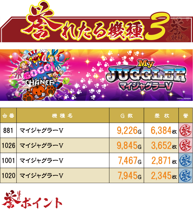 なんと881番台が6,000枚オーバーというとんでもない結果を叩き出した。とても『ジャグ』とは思えないこの結果に多くの方が驚かれたことだろう。さらにその陰で3台が2,000枚オーバーを達成!
