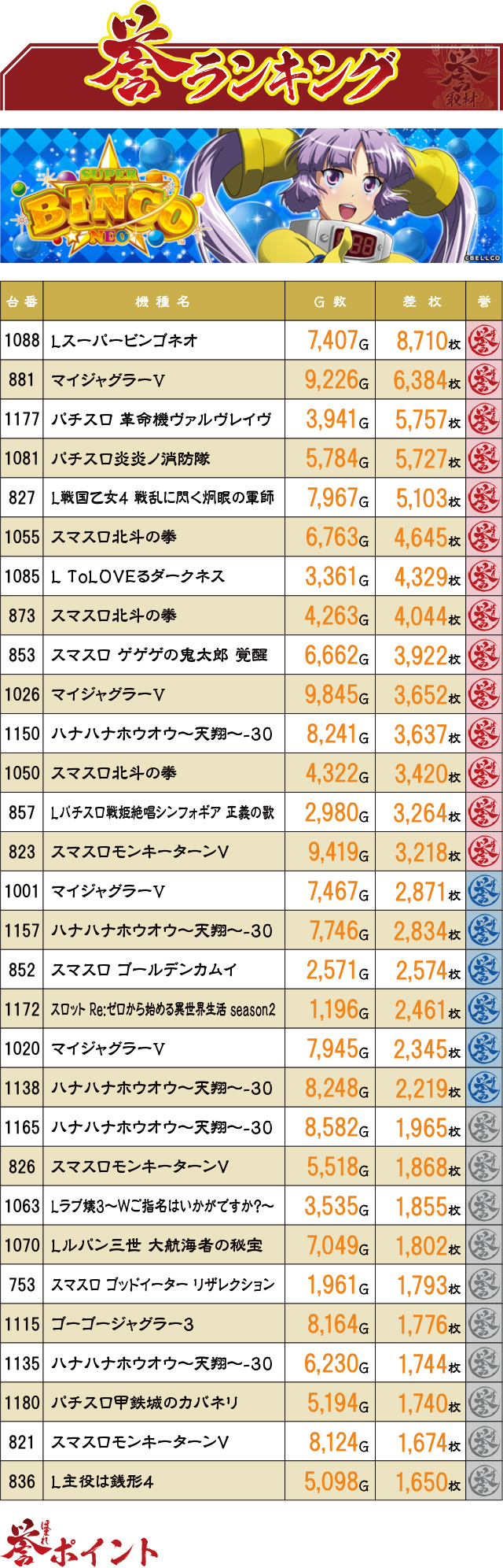 今回、誉ランキングの頂点に立ったのは、まさかの機種『Lスーパービンゴネオ』だった。9,000枚に迫る好レコードもさることながら、それ以上の衝撃を与えたのは、6,000枚オーバー記録で2位にランクインした『マイジャグラーⅤ』の存在だろう。
