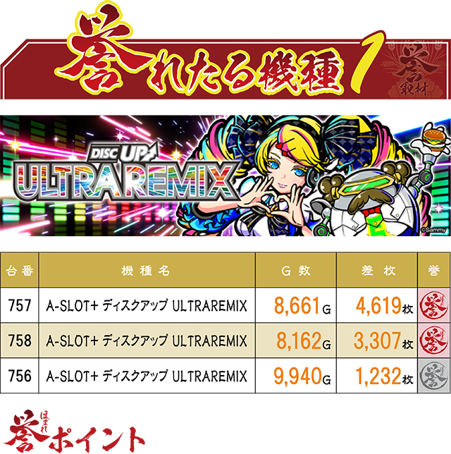 3台設置の『A-SLOT+ ディスクアップ ULTRAREMIX』が3台とも誉レコード(=1,000枚以上)だったばかりか、誉ランキングの2位に入賞するなど、誰が予想できただろうか。この結果から察するに、3台とも優秀台だった可能性も否めない。