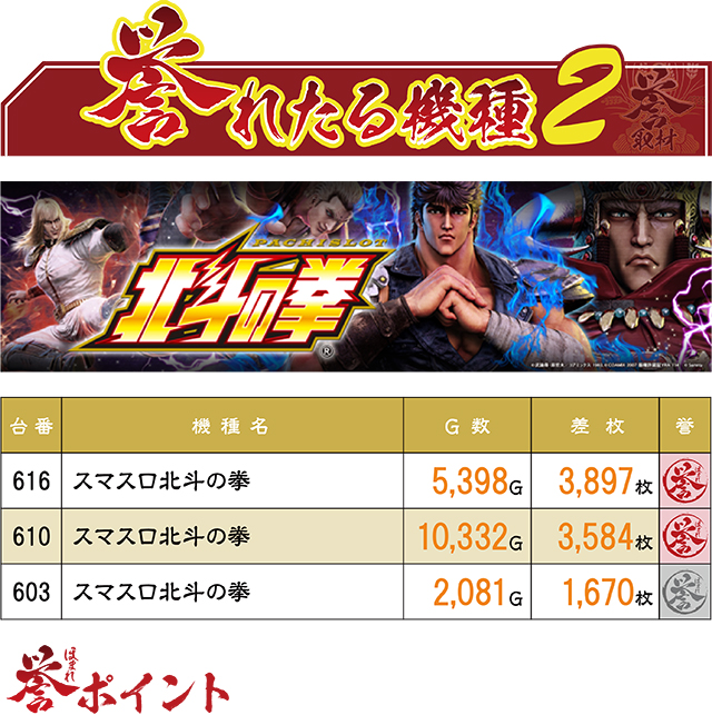 『スマスロ北斗の拳』からも同じく3台の誉レコードが誕生。しかしこちらは14台が設置されている『北斗』。ならばもう少し多くの誉レコードが生まれてもおかしくはなかった。次回は誉レコード台数のアップと5,000枚超え記録に期待!