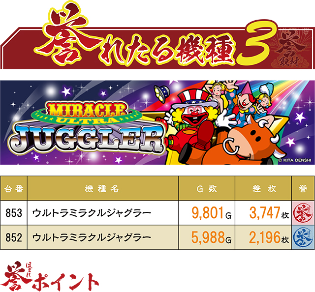 3台設置の『ウルトラミラクルジャグラー』は2台が誉レコードに。それも青誉&赤誉マークという上々の結果だった。前回は『アイム』から優秀結果が続出、今回は『ウルミラ』、次回輝く『ジャグ』は果たして…!?