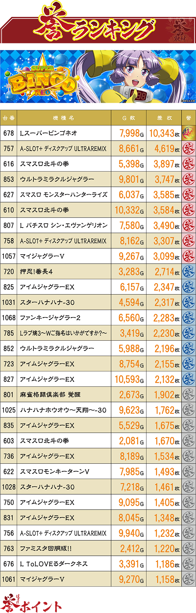 『Lスーパービンゴネオ』から10,000枚オーバー記録が飛び出し、そのままTOP差枚記録となった。さらに驚くことに、2位には『A-SLOT+ ディスクアップ ULTRAREMIX』がランクイン!主力マシンを完封し、この2機種がこの日の1位・2位の栄誉を勝ち取ることとなった。
