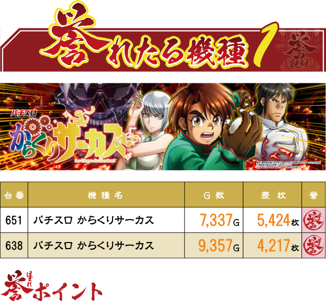 6台中2台が赤誉マーク(=3,000枚以上)となったのは『パチスロ からくりサーカス』。ともに順調にAT初当り&連チャンを実現し、好挙動のまま4,000枚オーバーを達成することとなった。