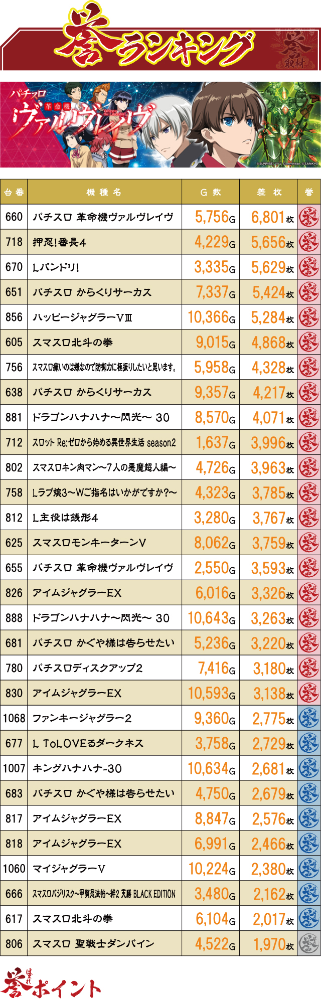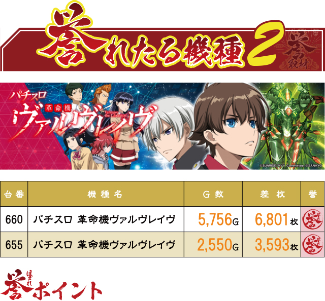 前回・今回と連続で誉ランキング1位に。相変わらずのポテンシャルの高さに加え、ココでの優秀台投入率の高さがその結果を生んだのだろう。次回も『パチスロ 革命機ヴァルヴレイヴ』の動向には目を光らせておくべし!
