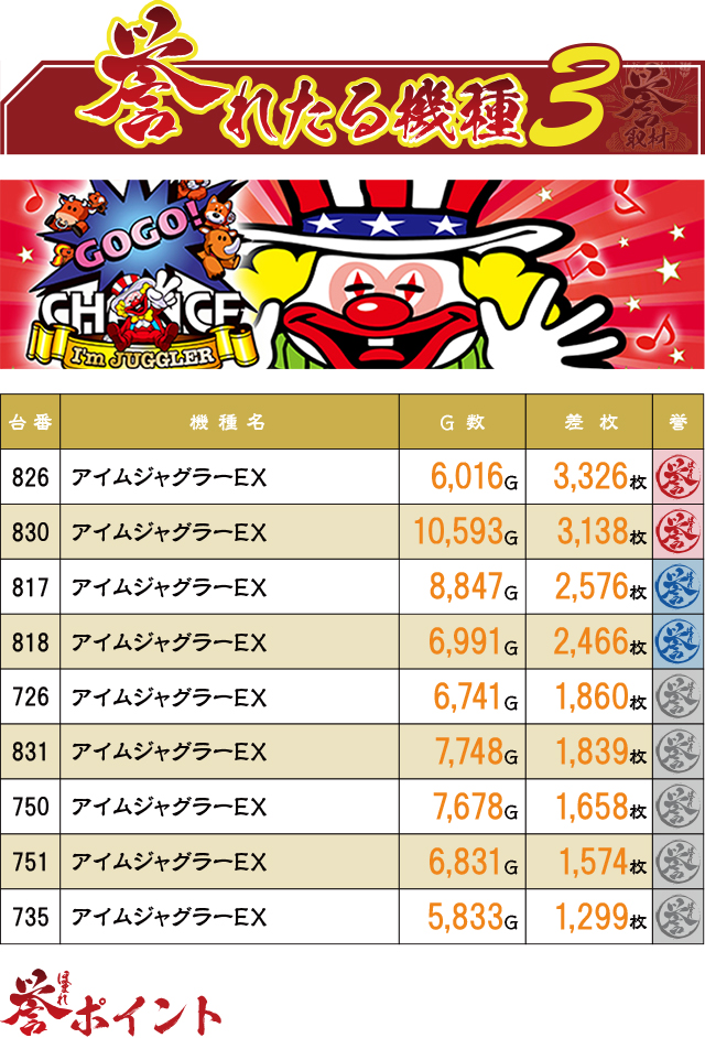 9台もの誉レコードを生み出した『アイムジャグラーEX』の中で、特に目立っていたのは赤誉マークの2台と青誉マーク(=2,000枚以上)の2台。それぞれ早いペースでGOGOランプをペカらせており、ボーナス合算確率は優秀台の数値を刻んでいた。