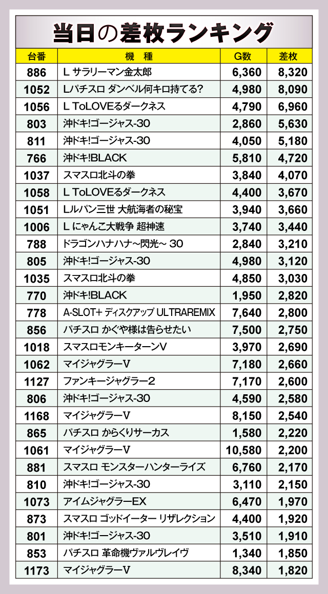 首位の座についたのは『L サラリーマン金太郎』。886番台が+8,320枚と見事な差枚を残している。おしくも2位となったのが『Lパチスロ ダンベル何キロ持てる?』で、1052番台が+8,090枚を叩きだした。