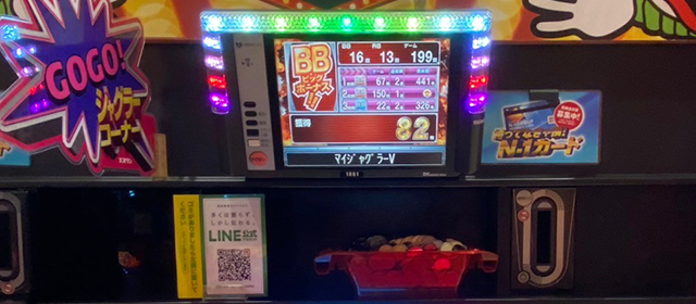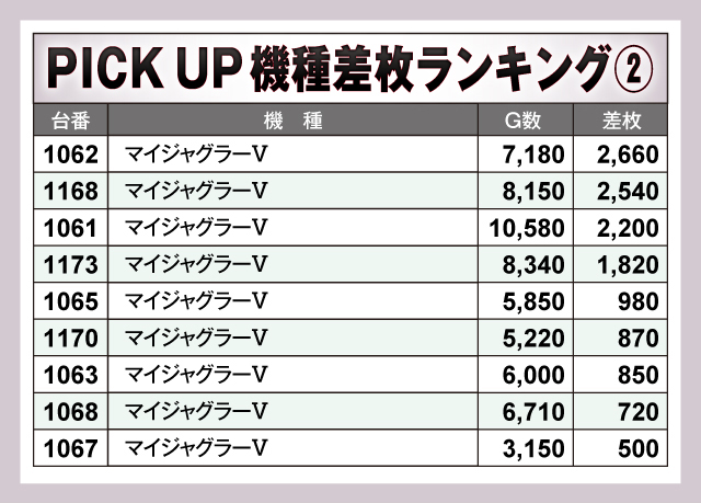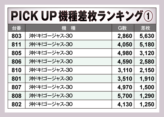 『沖ドキ!ゴージャス-30』の9台をピックアップして見てみると、いずれも少ないG数でなかなかの結果を出している様子がうかがえる。この機種のツボにハマった際の出玉性能を裏づけているようだ。対して『マイジャグラーⅤ』は人気もあってかいずれの台も高稼働。それにともなって安定した差枚となっているのは流石のひと言だ。