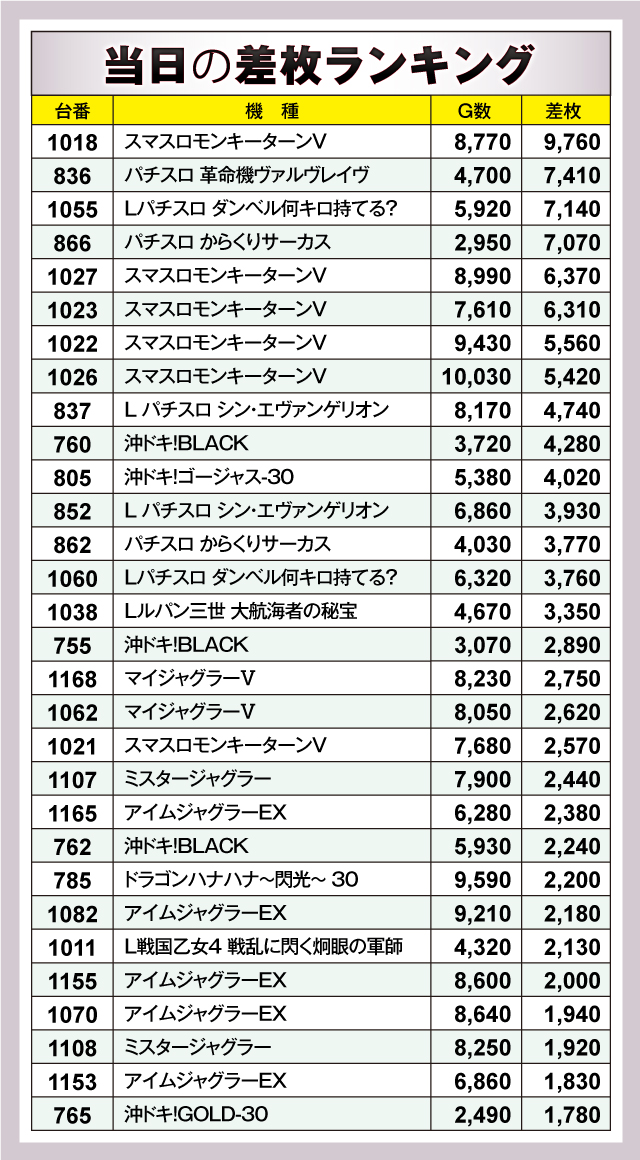 そして圧巻なのは1027番台の+6,370枚を筆頭に、4台並んだ『スマスロモンキーターンV』。トップの1018番台と+2,570枚の1021番台をあわせると、計6台もランクインしたことになる。そして『L パチスロ シン・エヴァンゲリオン』が導入早々に+4,740枚、+3,930枚と大勝をおさめている点にも注目したいところだ。