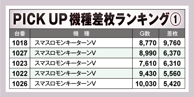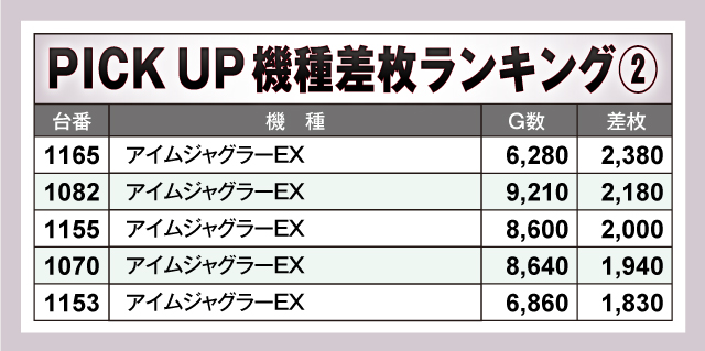 こちらでは、同店でもとくに人気の2機種に注目してみよう。差枚ランキングを席巻した『スマスロモンキーターンV』は10,030Gまわした1026番台を筆頭にいずれも高稼働。打ち手の期待に応えるように、立派な差枚を残している。『アイムジャグラーEX』に関しても、たくさん稼働しつつも安定した結果が出ていて、ノーマルタイプの持ち味が如実にあらわれていた。