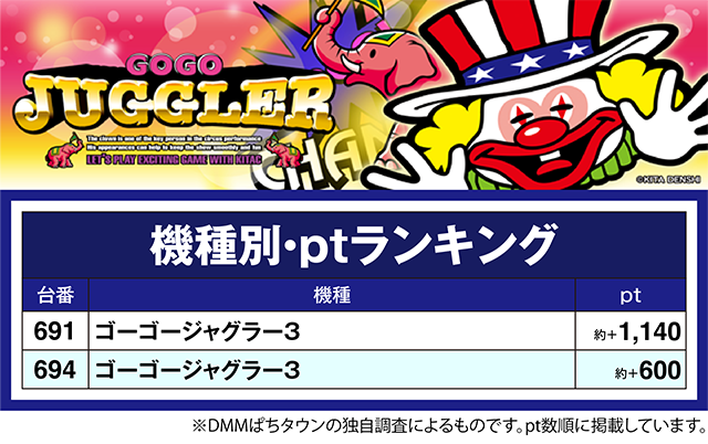 「ゴーゴージャグラー3」では、691番台が約+1,140ptで、694番台もプラス。