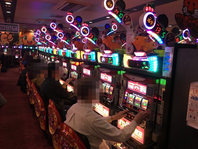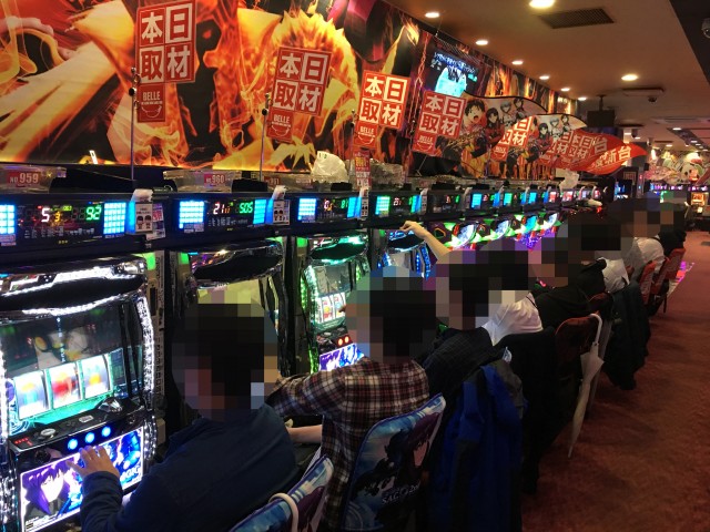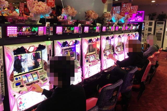 前回の取材時とおなじく、この日もたくさんのプレイヤーが来店。パチンコ・パチスロの各シマに笑顔が広がっていた。