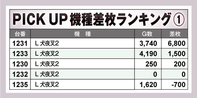 続いては、当日とくに盛り上がっていた導入直後の新台3機種を紹介。3機種とも好記録がてんこ盛りで、それらのなかでも「L 犬夜叉2」は、ピックアップ5台のうち3台がプラス差枚で終了と素晴らしい結果を残していた。もちろんその他2機種を含め、店内全体が活気に溢れていたぞ!