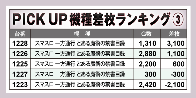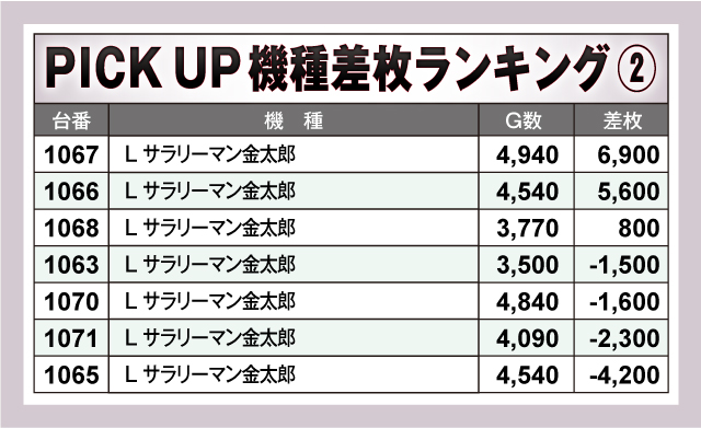 まずは差枚ランキングトップ30台のチェックから。30台のうち29台が+2,000枚オーバーを記録し、+3,000枚オーバーは18台出現! それらのなかでもっとも優秀だったのは、1638番台の「L ToLOVEるダークネス」で、差枚は+7,800枚と素晴らしい記録をマーク! その他ランクイン機種には、「パチスロ かぐや様は告らせたい」や「沖ドキ!BLACK」など、ファンから人気を集める機種を中心にチャンスがあったようだ!