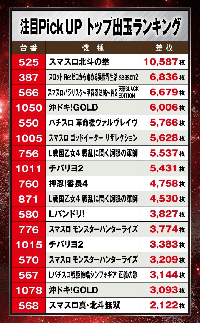 また、その他の機種を見てみると『スロット Re:ゼロから始める異世界生活 season2』と『スマスロバジリスク~甲賀忍法帖~絆2 天膳BLACK EDITION』、『沖ドキ!GOLD』の+6,000枚超をはじめ、様々な機種で好成績が多数飛び出していた。