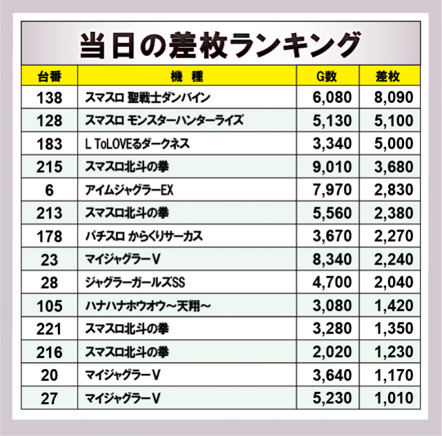 まずは差枚ランキングのチェックから。『スマスロ 聖戦士ダンバイン』から8,000枚OVERが飛び出し、さらに『スマスロ モンスターハンターライズ』『L ToLOVEるダークネス』では5,000枚OVERを達成するなど、各所で大台突破台が生まれている。その中で『ジャグラー』シリーズも存在感を放っており、回転数と差枚数が比例する展開を披露。全体的に高い活気を披露していたのも見逃せないポイントで、遊技していたファンは有意義な時間を過ごしていたはずだ。