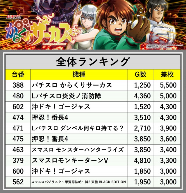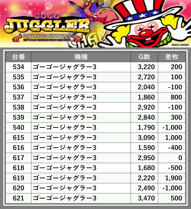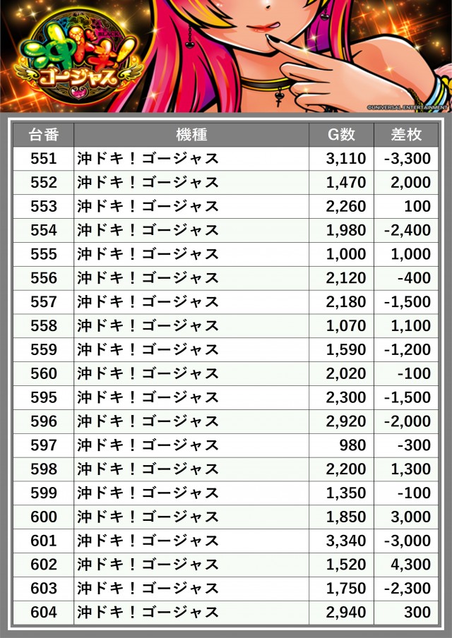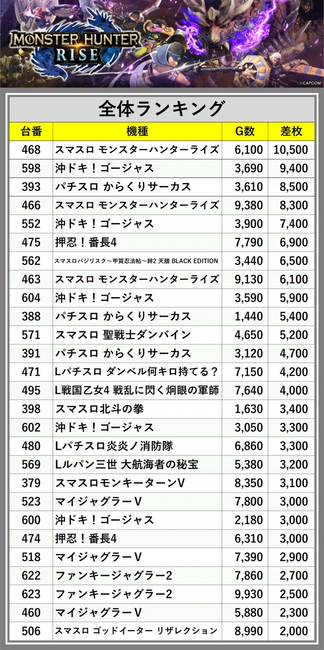 厳選された取材対象機種をはじめ、その他スロット全体から好記録が飛び出した!プレイヤーが楽しんだ1日を下記データにて振り返ってみて欲しい。