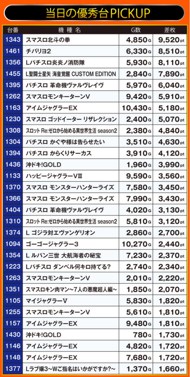 この日、最もプレイヤーの注目を集めたのが『スマスロ北斗の拳』で、万枚目前の+9,000pt超を叩き出し見事ランキングのトップに輝いた。次いで、『チバリヨ2』と『Lパチスロ炎炎ノ消防隊』が+8,000pt超を記録するなど、人気機種を中心に様々なシマからハイスコアが続出している。