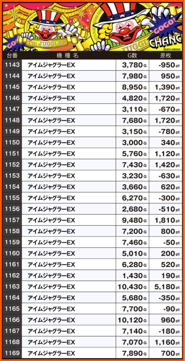 続いて注目機種をチェックしてみると、『マイジャグラーⅤ』からは+5,000pt超、『スマスロ モンスターハンターライズ』からは+3,000pt超が2台発生。また、『ジャグラーガールズSS』は全6台中4台がプラス差枚で終了する安定感を見せつけファンを喜ばせていた。